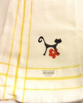chat brodé silhouette -100% coton, blanc à rayures jaune, dim 50 x 70 cm