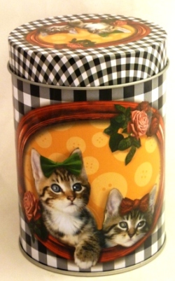 Les chats rétro -Boite en fer , fond vichy noir et blanc, avec chats rétro , dim hauteur 13 cm et 8,5 cm de diamètre
