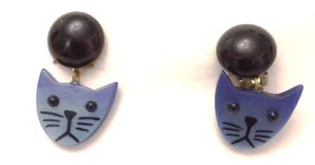 Boucles d'oreilles chat bleues , en galalithe composée à partir de la caséïne du lait et entièrement fait main. Pour oreilles non percées également. Largeur 3 cm et 3 cm de haut.