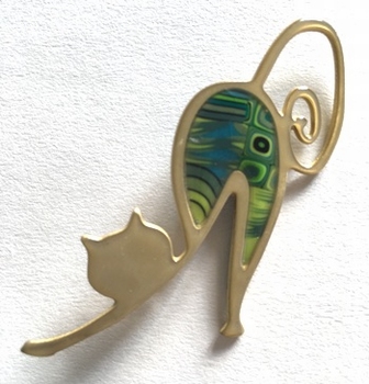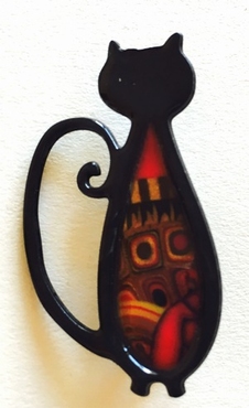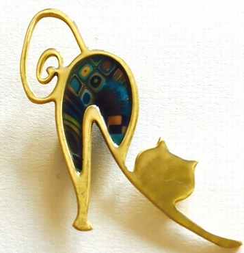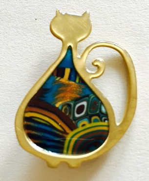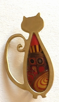 Broche chat mince -Contour doré, 4 cm x 2,5 cm Métal et polymère. Les motifs colorés font partie du modèle (ils ne sont pas peints). Fabrication artisanal en france