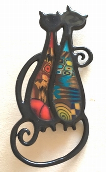 Broche couple de chats -Contour noir, 7,5 cm x 3 cm Métal et polymère. Les motifs colorés font partie du modèle (ils ne sont pas peints). Fabrication artisanal en france