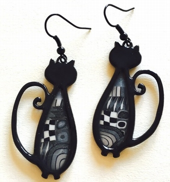 Boucle d'oreilles chats mince -Contour noir, 4 cm x 2,5 cm Métal et polymère. Les motifs colorés font partie du modèle (ils ne sont pas peints). Fabrication artisanal en france