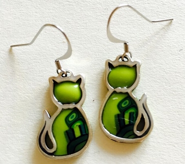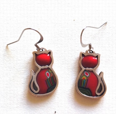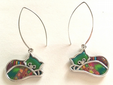 Boucle d'oreilles pendantes chats couchés -Contour argenté, 3,5 cm x 2,5 cm Métal et polymère. Les motifs colorés font partie du modèle (ils ne sont pas peints). Fabrication artisanal en france