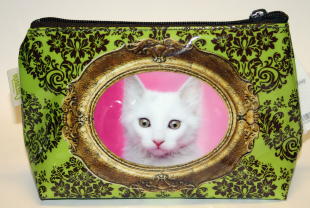Le chat baroque -rés chic avec sa poignée, ressemble à une petite malette avec sa fermeture eclair tout autour. En pvc et vinyl, hauteur 22 cm , largeur 27 cm et 10 cm de profondeur.