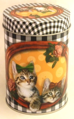 Les chats rétro -Boite en fer , fond vichy noir et blanc, avec chats rétro , dim hauteur 13 cm et 8,5 cm de diamètre