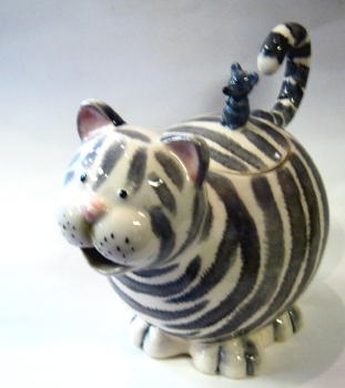 Gros chat rayé gris -En faience, une peite souris sur le couvercle, hauteur 19 cm et 24 cm de large