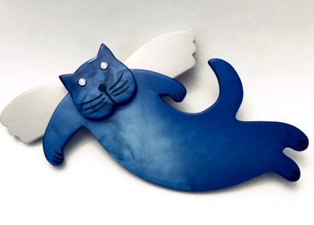 Broche chat bleu, en galalithe composée à partir de la caséïne du lait et entièrement fait main. signée Pavone. Largeur 12 cm et 6.5 de haut.