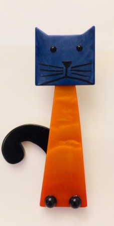 Broche chat allongé orange et bleue, en galalithe composée à partir de la caséïne du lait et entièrement fait main. signée Pavone . Hauteur 9 cm et 5 cm de large.