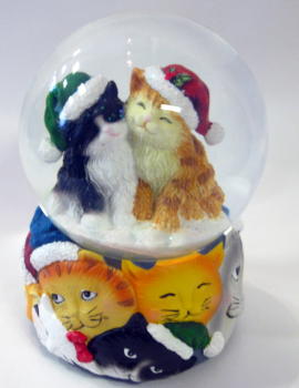 Boite à musique -Sur un socle sculpté de têtes de chats de noël, une boule enneigée au son de la musique ` we wish you a merry chrismas`, dim 11 cm de large et 14 cm de haut.