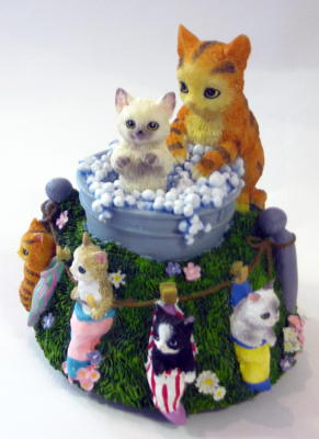 Boite à musique -En résine, hauteur 13 cm et 10 cm de large, la maman chat donne le bain à ses chtaons au rythme de la musique . le chaton tourne sur lui-même dans le bain pendant que les autres sèchent tout autour du socle.