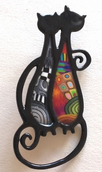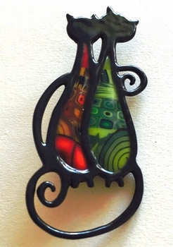Broche couple de chats -Contour noir, 7,5 cm x 3 cm Métal et polymère. Les motifs colorés font partie du modèle (ils ne sont pas peints). Fabrication artisanal en france