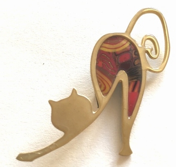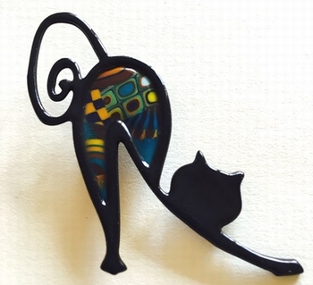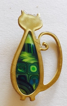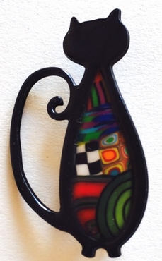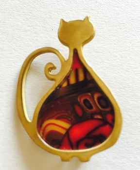 Broche chat mince -Contour doré, 4 cm x 2,5 cm Métal et polymère. Les motifs colorés font partie du modèle (ils ne sont pas peints). Fabrication artisanal en france