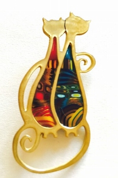 Broche couple de chats -Contour doré, 7,5 cm x 3 cm Métal et polymère. Les motifs colorés font partie du modèle (ils ne sont pas peints). Fabrication artisanal en france