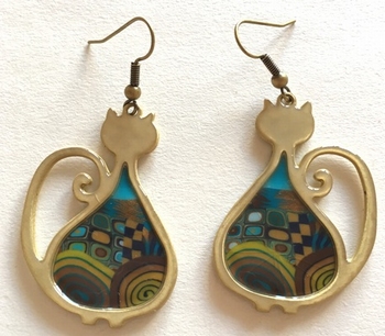 Boucle d'oreilles gros chat -Contour doré 4 cm x 3,5 cm Métal et polymère. Les motifs colorés font partie du modèle (ils ne sont pas peints). Fabrication artisanal en france
