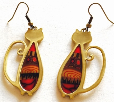 Boucle d'oreilles chats mince -Contour doré, 4 cm x 2,5 cm Métal et polymère. Les motifs colorés font partie du modèle (ils ne sont pas peints). Fabrication artisanal en france