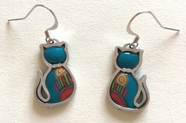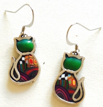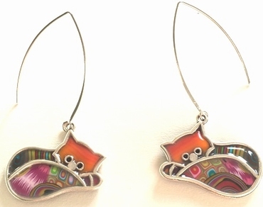 Boucle d'oreilles pendantes chats couchés -Contour argenté, 3,5 cm x 2,5 cm Métal et polymère. Les motifs colorés font partie du modèle (ils ne sont pas peints). Fabrication artisanal en france