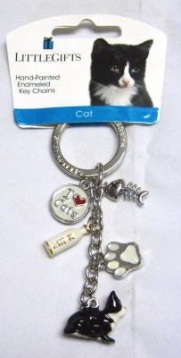 Chat noir et blanc couché -4 breloques et un chat en métal emaillé, Longueur 8 cm