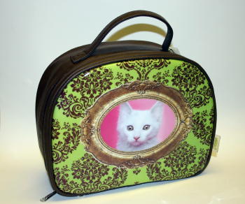 Le chat baroque -rés chic avec sa poignée, ressemble à une petite malette avec sa fermeture eclair tout autour. En pvc et vinyl, hauteur 22 cm , largeur 27 cm et 10 cm de profondeur.